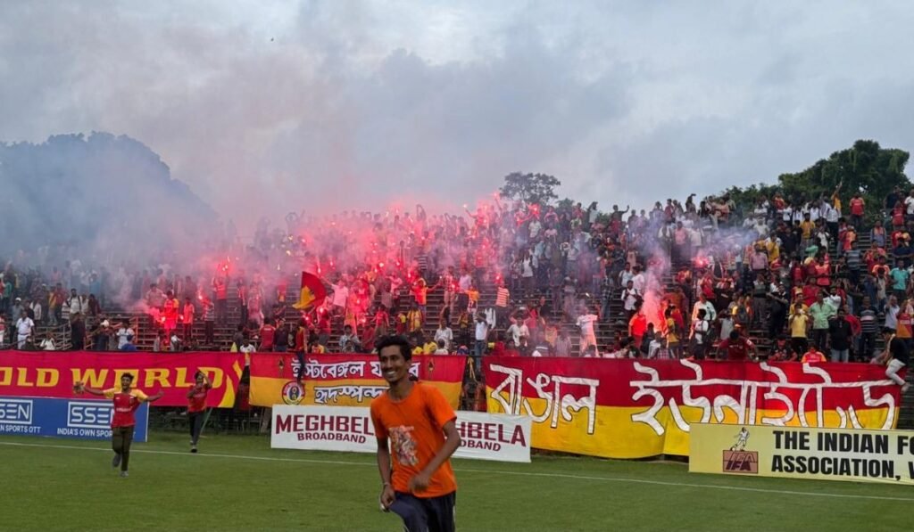 Within 94 minutes after receiving the last season’s CFL winner’s trophy from Mayor Firhad Hakim, East Bengal ensured their second consecutive CFL title at home on Monday. The post-match jubilation of the fans may indicate that the red-and-gold brigade grabbed the title effortlessly. The first 45 minutes looked alike. East Bengal had superiority. They created opportunities. Their ISL-experienced footballers, like David, PV Vishnu, and Sayan Bannerjee, missed a series of sitters before David drew first blood in the 43rd minute. United custodian Raunak Ghosh was brilliant, saving his team from conceding a couple of goals in the first session. But United Sports bounced back after the break. Exhibiting excellent passing football that helped gain possession in the middle third, United Sports put East Bengal’s midfield and defenders to embarrassment. The reflection was vivid when Amit Basak equaled the score-line with a header from inside the box on a measured center from Srinath M from right. The impact of pressure by the United Sports also transpired among the fans as they looked scared and started offering abusive chanting continuously out of frustration. East Bengal would have been the League champion even with a 1-1 draw. Still Shyamal Besra gave them the lead in the 89th minute from a goalmouth melee. But before East Bengal took the lead, United Sports were clearly deprived of a spot-kick when Dipesh Murmu was pushed from behind inside the box as the ball was in front of him, and East Bengal custodian was in a dilemma while coming forward to ward off the movement. The score-line could have been 2-1 in favor of United Sports. Lalkamal Bhowmick, the coach of United Sports, said, “East Bengal won the title. But today their victory was tarnished by the referee. It was not a fair victory.”
